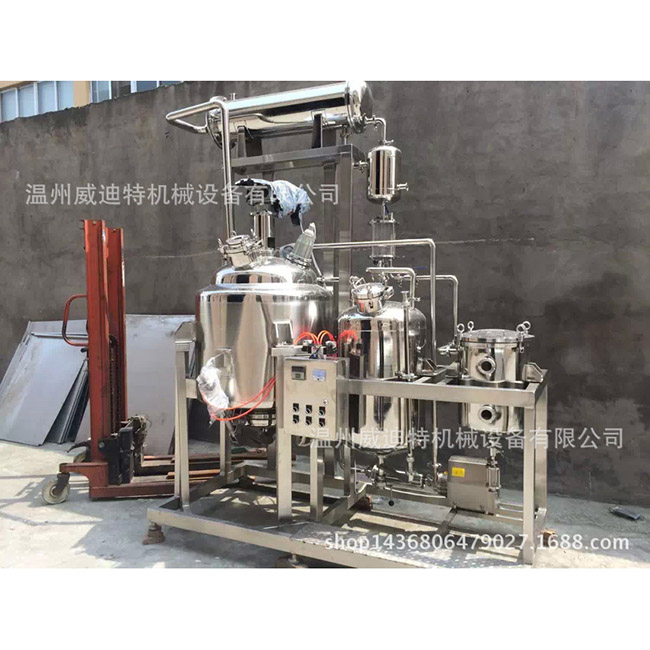 植物提取罐將準(zhǔn)備好的處方藥放入提取罐,在一定時間內(nèi)一次浸泡5-10倍(根據(jù)溶劑性質(zhì)和工藝要求而定的藥品量),然后打開蒸汽閥加熱并常用的夾套加熱,在沸騰并提取一定時間后(僅在用水提取芳香油時才進行直接蒸汽加熱),從提取槽底部提取的熱提取物可以通過過濾器屏幕連續(xù)過濾到過濾器。輸入集中器。在濃縮過程中產(chǎn)生的蒸汽進入冷凝器,成為冷凝液,并作為新的溶劑噴入萃取罐。