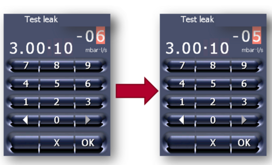 示例:3·10-6 mbar·l/s 校準(zhǔn)泄漏將用于校準(zhǔn)。系統(tǒng)將使用空氣中 10% 的氦氣混合物。因此,只有 10% 的泄漏氣體是氦氣。在這種情況下,可以將泄漏率設(shè)置為3·10-6 mbar · l/s / 10% = 3·10-5 mbar·l/s。在校準(zhǔn)程序中,系統(tǒng)將在校準(zhǔn)后正確顯示所有檢測到的泄漏率