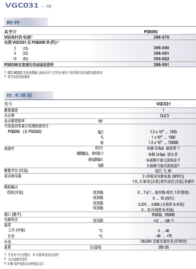 INFICON 真空計控制器 031(VGC031)設計為搭配 INFICON 皮拉尼儀表增強型 050(PGE050)使用,可提供方便的電源、控制和讀數。VGC031 和 PGE050 采用靈活的組合來監(jiān)測 1.3 x 10-4 至 1333 mbar(1 x 10-4 至 1000 Torr)的真空系統(tǒng)。VGC031 及其節(jié)省空間的面板安裝殼體支持各種技術功能,例如 2 個設定點繼電器、4 個用戶可選模擬輸出,并額外提供 RS232/ RS485 數字接口。明亮、流暢而清晰的 OLED 顯示器及集成鍵盤用戶界面為這種用戶友好的真空計控制器套裝錦上添花。堅固的工業(yè)設計讓 VGC031 與對流增強 PGE050 儀表傳感器的組合成為許多需要低至高真空度范圍的經濟型真空測量功能的真空應用中的出色選擇。