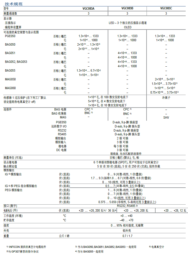 INFICON 真空計(jì)控制器 VGC083 設(shè)計(jì)于與被動(dòng)型真空規(guī)管 BAG05x 或 MAG0x0 和 PGE050 在固定的組合下: 兩個(gè) PGE050 真空規(guī)管和一個(gè) BAG05x 或 MAG0x0 真空規(guī)管一起使用. 用 BAG 和 PGE 真空規(guī)管, VGC083 控制與監(jiān)測(cè)真空壓強(qiáng)從大氣壓( ATM) 低至 2.7×10-11 百帕 | 毫巴. 六 (6) 個(gè)被指定于任何真空規(guī)管的單極繼電器與 RS232 和 RS485 接口有助于系統(tǒng)的集成. 具有堅(jiān)固工業(yè)結(jié)構(gòu)的 VGC083 與被動(dòng)型真空規(guī)管的組合為要求寬的真空測(cè)量范圍的真空應(yīng)用提供既可靠又經(jīng)濟(jì)的測(cè)量.